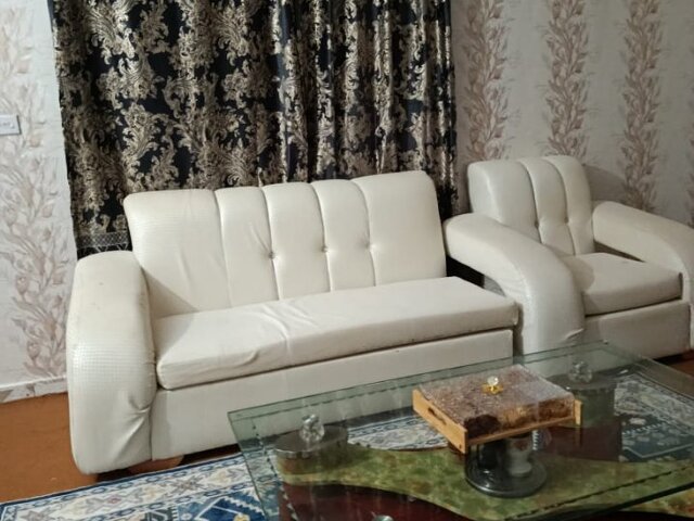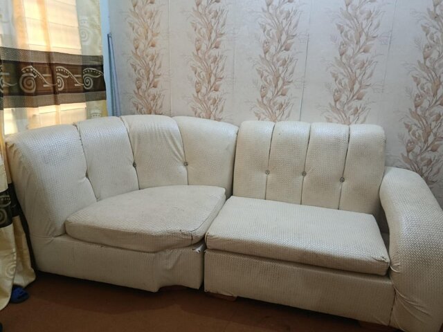 The sofa is used but well maintained and comes with a white cover, which helps keep it clean and gives it a fresh, neat look. The L-shape design maximizes seating while saving space and adds a stylish touch to any home.